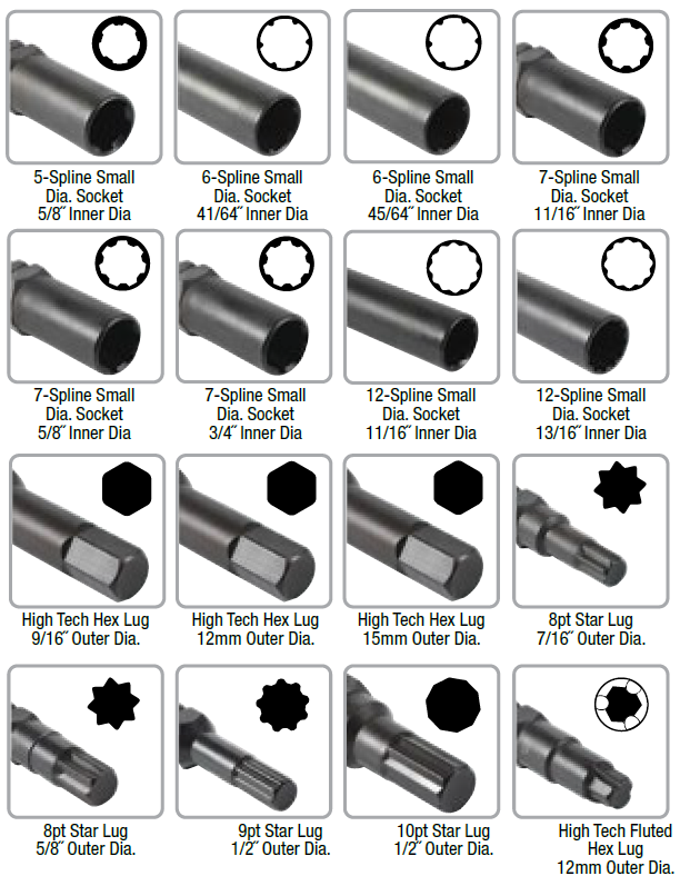 • Include eight socket & eight bit style tools that can be used on spline, star, hex & fluted hex fasteners