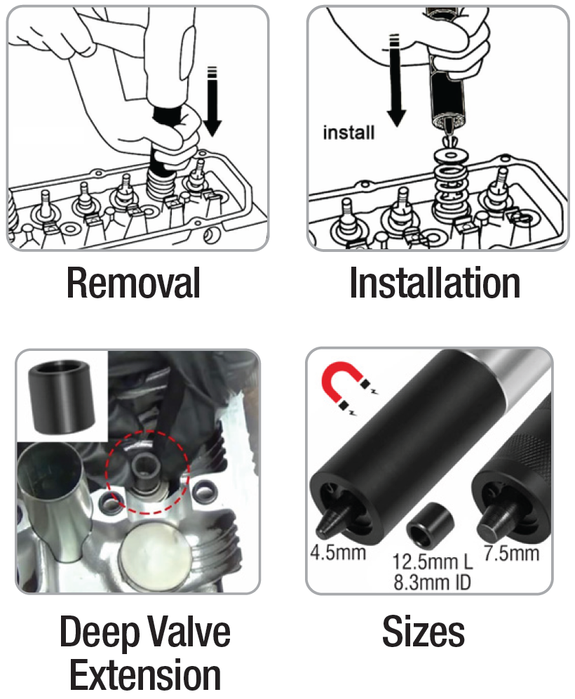 • Suits most overhead valve engines with 4.5 to 7.5mm valve stems